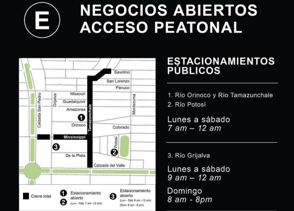 En este sentido, detalló que de lunes a sábado será de 07:00 a las 24:00 horas en los estacionamientos de Río Orinoco y Río Tamazunchale y de Río Potosí.