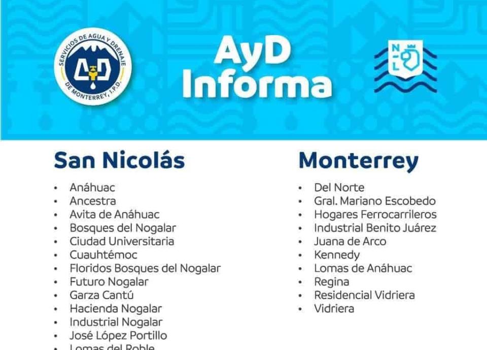 Por reparación de tuberías y el cambio de válvulas, Servicios de Agua y Drenaje de Monterrey informó el corte del suministro en 36 colonias de San Nicolás y Monterrey.