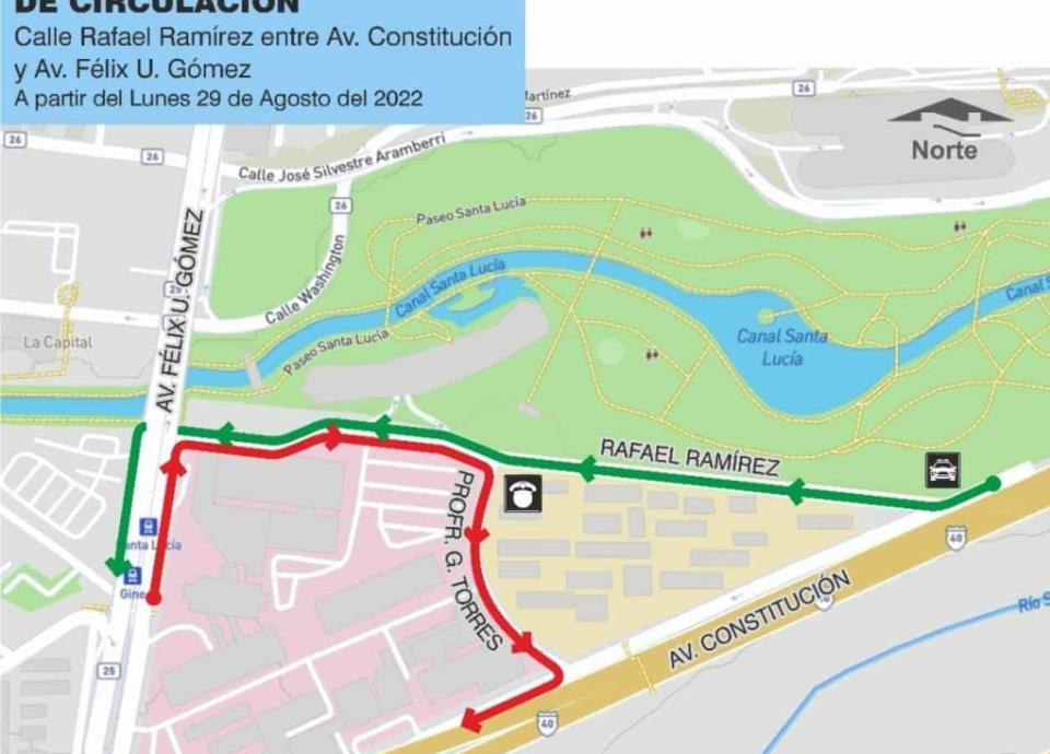 El sentido de circulación en la calle Rafael Ramírez, desde la avenida Constitución a Félix U. Gómez cambiará, ahora será de oriente a poniente, a partir del lunes 29 de agosto informó la Secretaría de Desarrollo Urbano Sostenible de Monterrey.