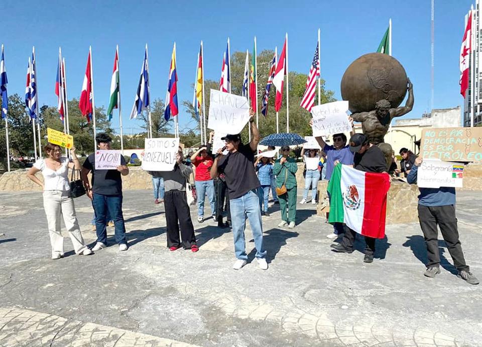 Ciudadanos mexicanos realizaron este sábado una manifestación en la Plaza de las Banderas, en el centro de Monterrey, para expresar su rechazo a los recientes acontecimientos ocurridos en Venezuela y fijar su postura ante el incremento de la tensión internacional derivada de dichos hechos.