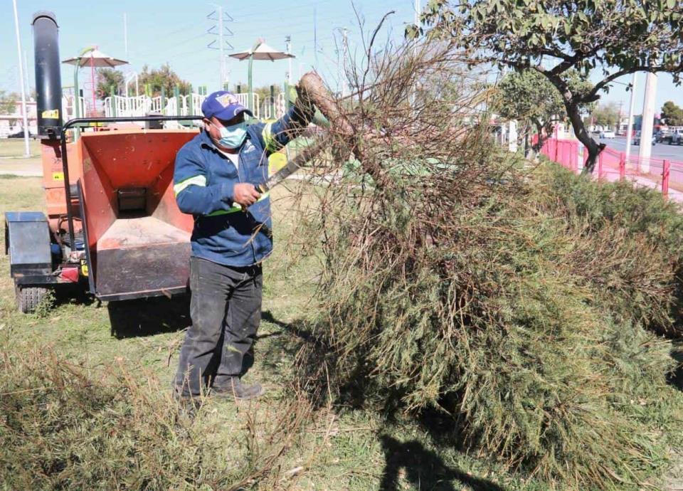 Los pinos llevados a los centros de recolección son triturados con maquinaria especializada. El material triturado es convertido en composta y ésta se utiliza como fertilizante para parques y camellones.