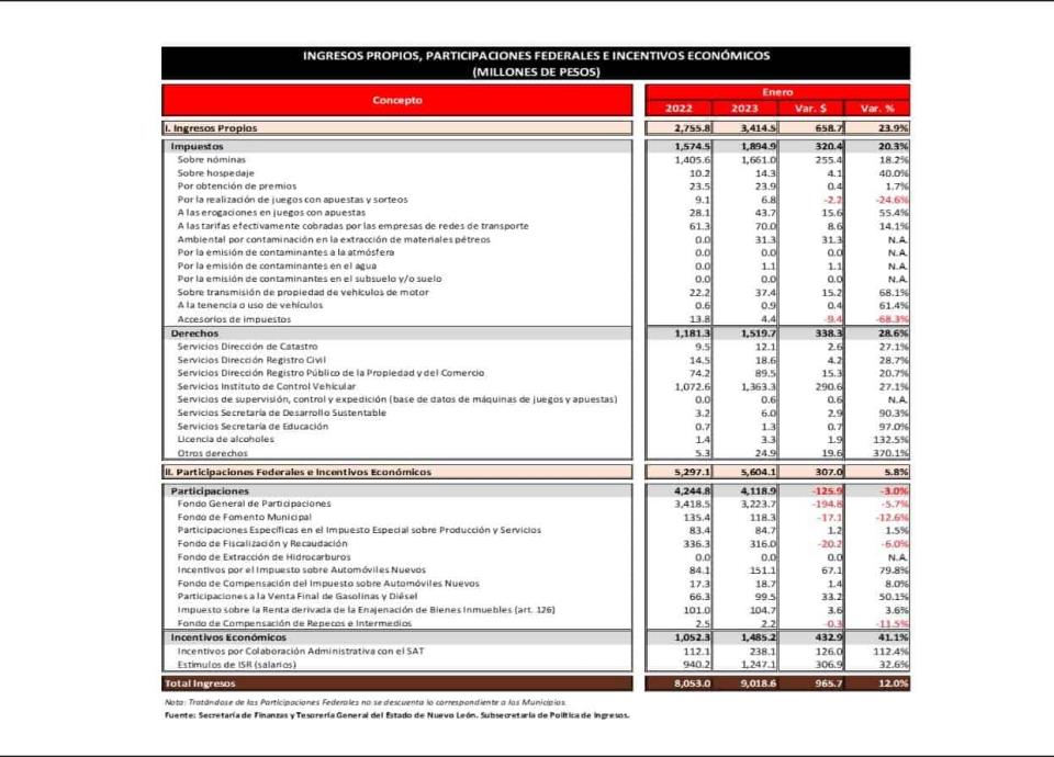 Con 9 mil 018.6 millones de pesos al cierre del mes de enero, los ingresos de Nuevo León registraron un crecimiento del 12 por ciento.