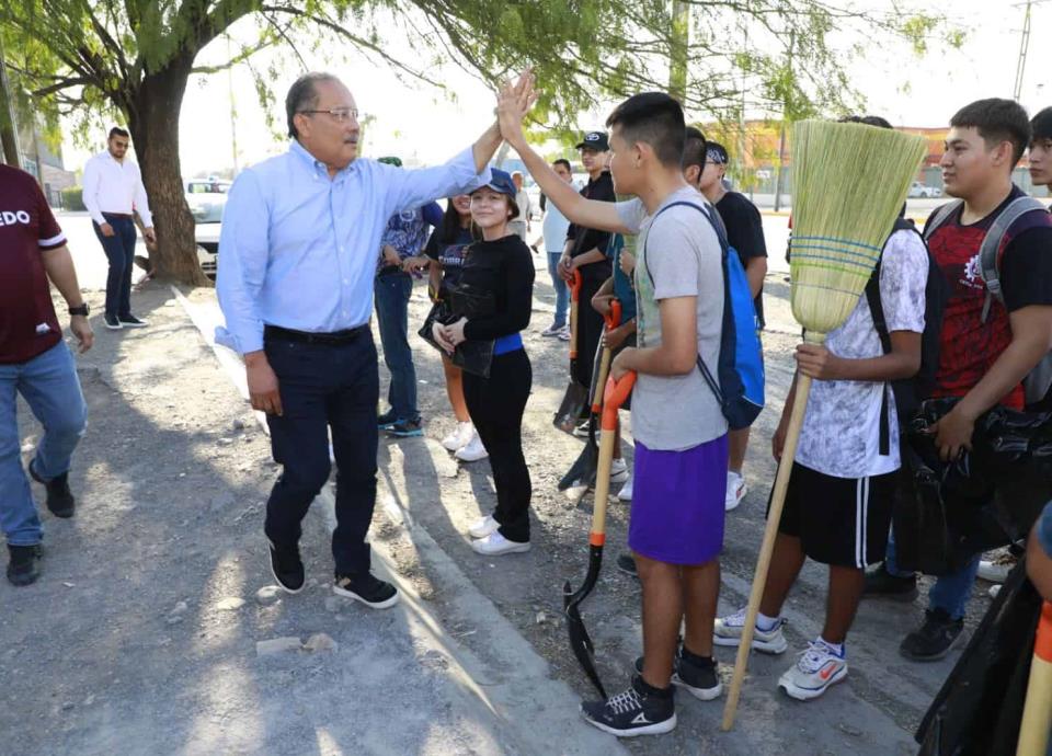 Los trabajos iniciaron en Benito Juárez y Donato Elizondo y también en Raúl Salinas y Cristóbal Colón en donde “armaron” a los estudiantes con herramienta para realizar la limpieza.