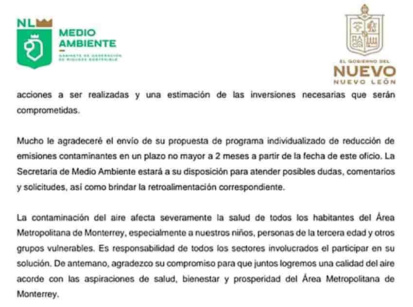 "De antemano, agradezco su compromiso para que juntos logremos una calidad del aire acorde con las aspiraciones de salud, bienestar y prosperidad del Área Metropolitana de Monterrey", añade.