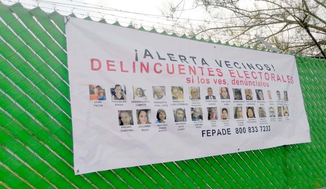 En las mantas colocadas aparecían los rostros y nombres de 27 personas, a quienes señalaron como los delincuentes electorales del municipio.