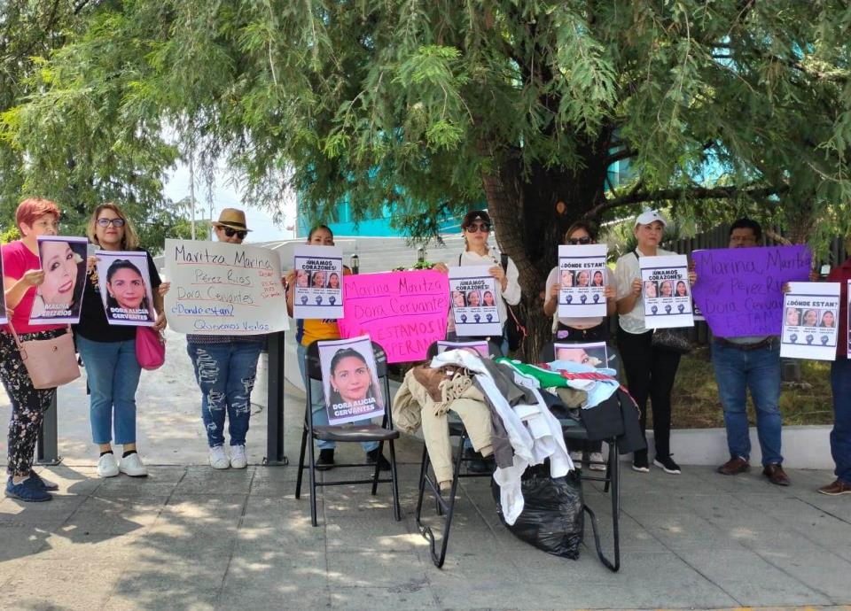 Familiares y amigos de Marina y Maritza Pérez Ríos y Dora Alicia Cervantes protestaron frente a la Fiscalía General del Estado y posteriormente recorrieron las calles del primer cuadro de la ciudad para exigir resultados en la búsqueda de las mujeres desaparecidas.