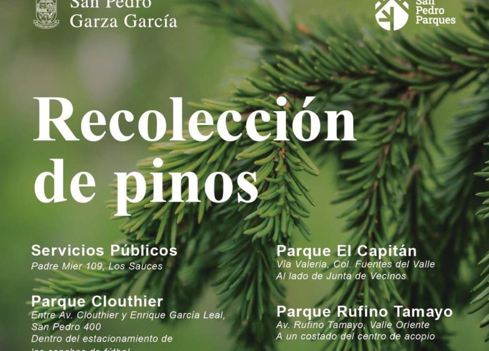 Tras concluir los festejos navideños, el municipio de San Pedro Garza García habilitó puntos de acopio de pinos naturales en los parques como el Parque Clouthier, El Capitán, Rufino Tamayo, Bosques del Valle y adicionalmente las oficinas de Servicios Públicos.