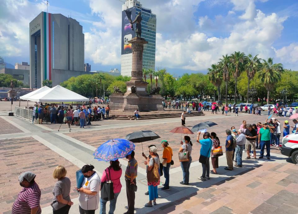 Ataviados con paraguas para cubrirse del sol, ya sea a pie, andadera o silla de ruedas, esperaron en la fila por más de tres horas.