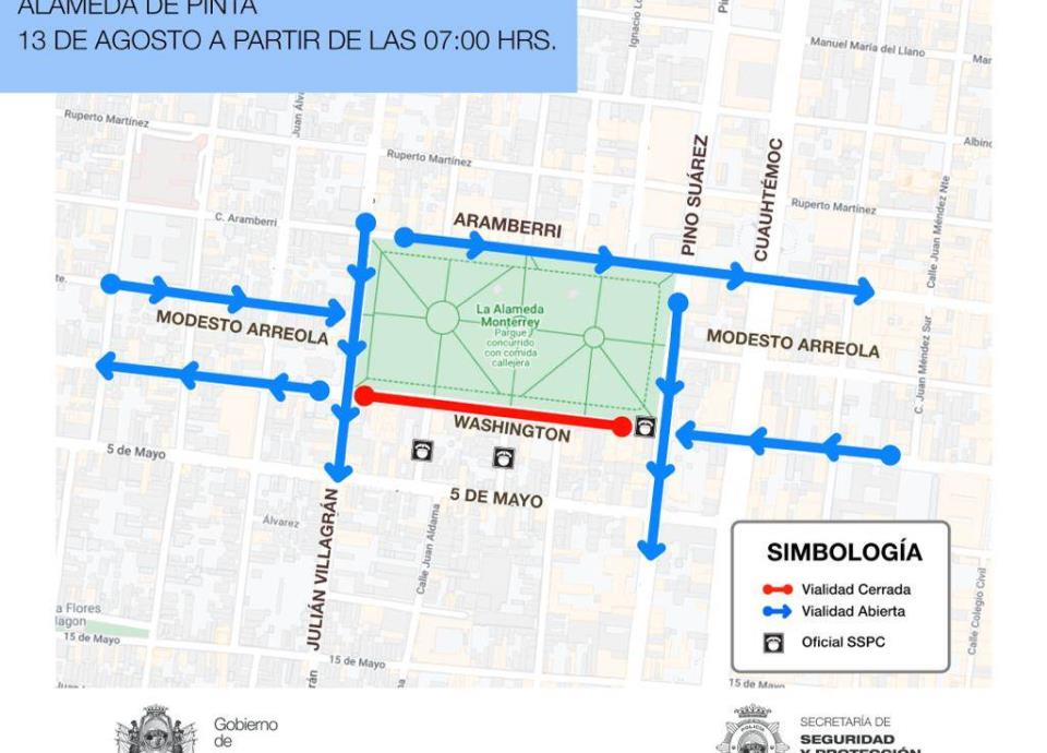 Un grupo de Oficiales de Policía y Tránsito de Monterrey se encargará de dar seguridad a los asistentes y como vías alternas los conductores podrán tomar las calles 15 de Mayo y Ruperto Martínez para dirigirse al poniente de la Ciudad.