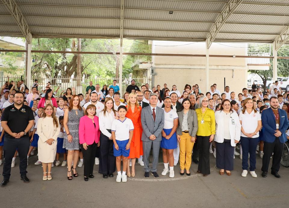 En la Escuela Primaria Profesor Oziel Hinojosa García, en Monterrey; Alma Rosa Marroquín Escamilla, titular del área, aplicó las primeras vacunas a alumnos y alumnas de 5° grado.
