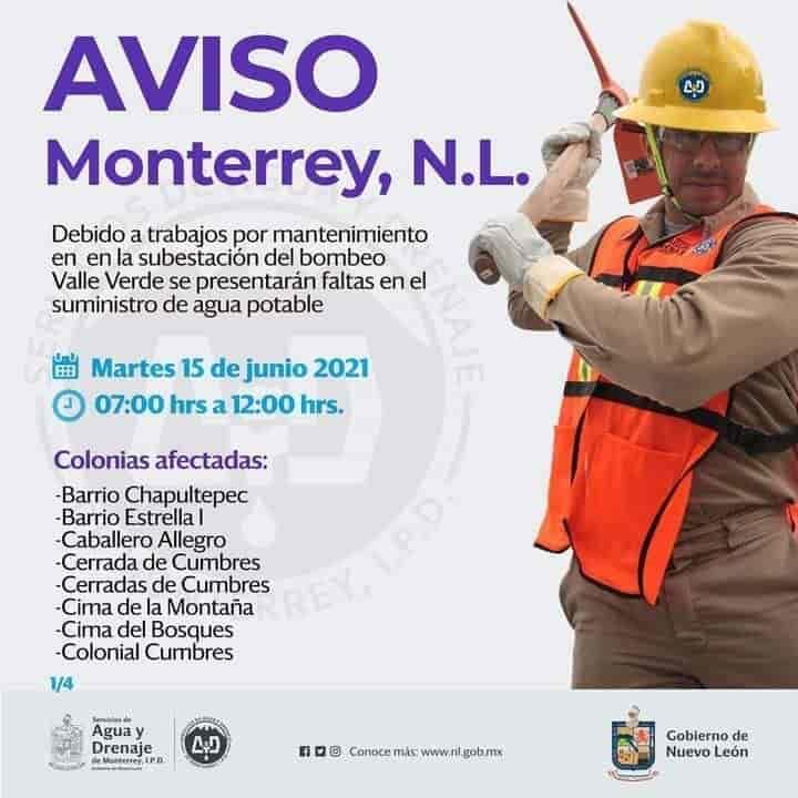 Lo anterior debido a trabajos de mantenimiento en la subestación del bombeo Valle Verde.