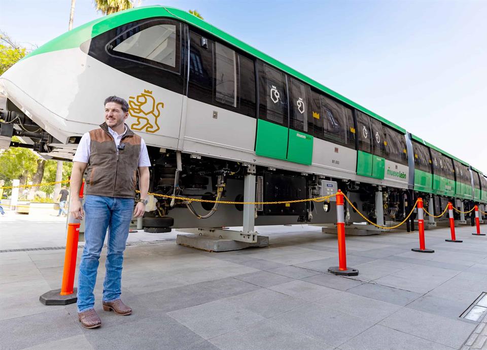 Desde la Explanada del LABNL frente a Palacio de Gobierno, el mandatario estatal mostró "el trenezote" de seis carros que alimentará al Monorriel más largo del Continente.