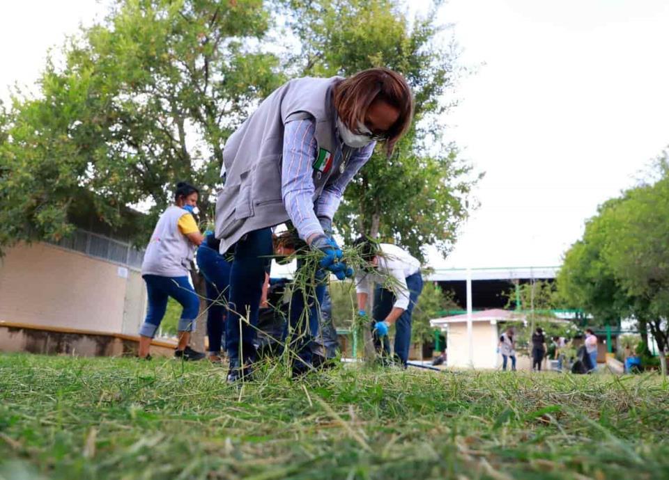 Empleados de más de 17 dependencias del gobierno municipal de Guadalupe colaboran por las tardes en la limpieza de planteles escolares, para darles mantenimiento y a la vez evitar la proliferación del mosquito trasmisor del dengue, zika y chikungunya.