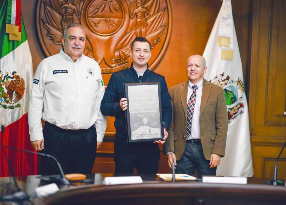 El alcalde Luis Donaldo Colosio recibió una placa con el logro de manos de Miguel Garza Flores, Director Ejecutivo de Insyde.