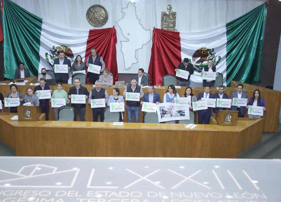Cuando la diputada priista le daba lectura al dictamen, los legisladores del PRI y el PAN se subieron a la tribuna con carteles en mano en los que señalaban “Nuevo León tiene soberanía”.