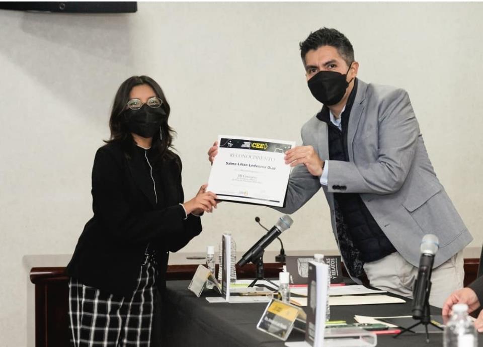 Durante la ceremonia se entregaron reconocimientos a las menciones honoríficas, que fueron para Eduardo Pérez Espinosa, por su texto: “El valor de X”; Roque Cázares Rodríguez, por su escrito: “Mi participación en las elecciones sin precedentes”; y para Sergio Silvestre Martínez Madera, por su relato: “Atípica tarde”.