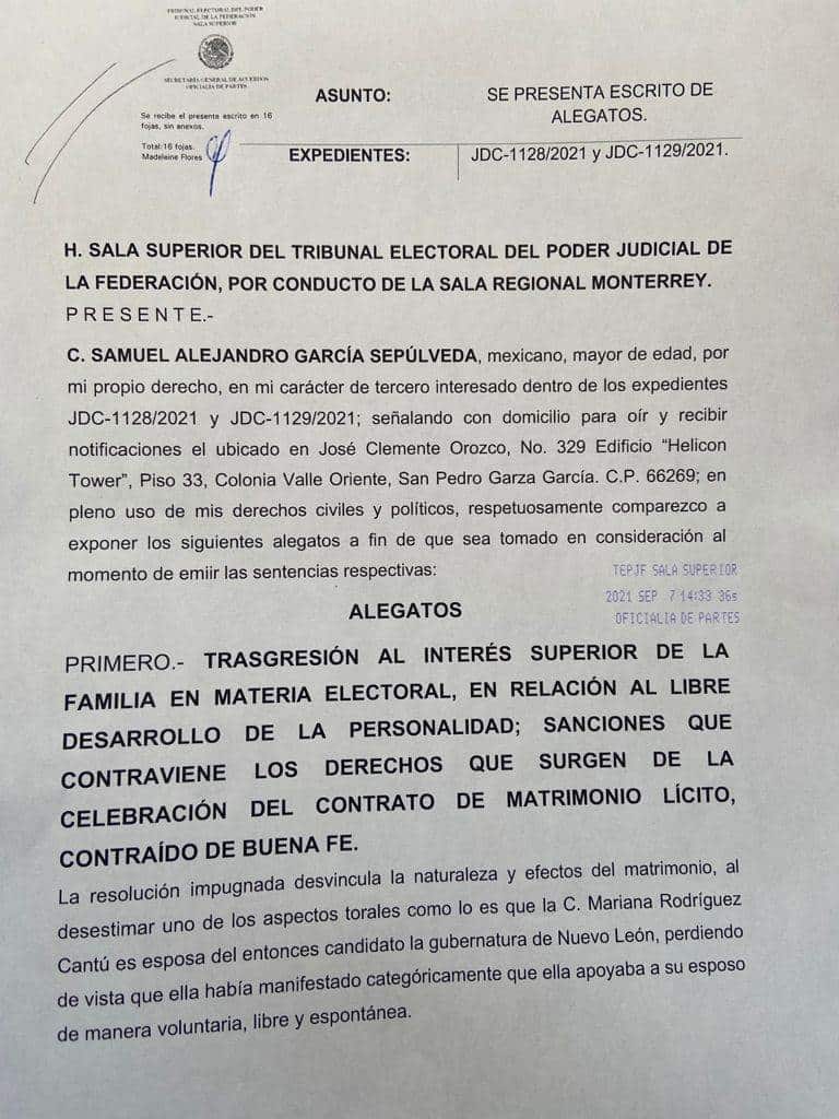 El gobernador electo, Samuel García Sepúlveda, acudió ante el Tribunal Electoral, para presentar seis alegatos contra la sanción que impuso el INE por las historias que su esposa Mariana Rodríguez difundió durante la campaña.
