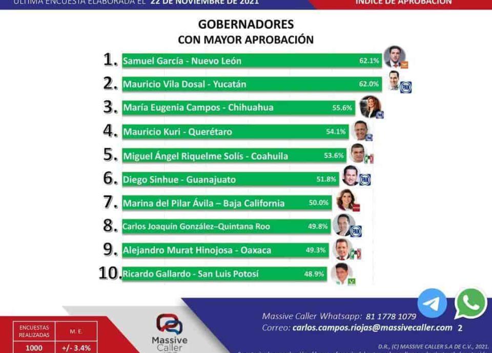Según las cifras al cierre del mes de noviembre, le siguen los panistas Mauricio Vila, gobernador de Yucatán, con un 62 por ciento; María Eugenia Campos, de Chihuahua, con un 55.6 por ciento Mauricio Kuri, de Querétaro, con 54.1 por ciento; y el tricolor Miguel Ángel Riquelme, de Coahuila, con 53.6 por ciento de aprobación.