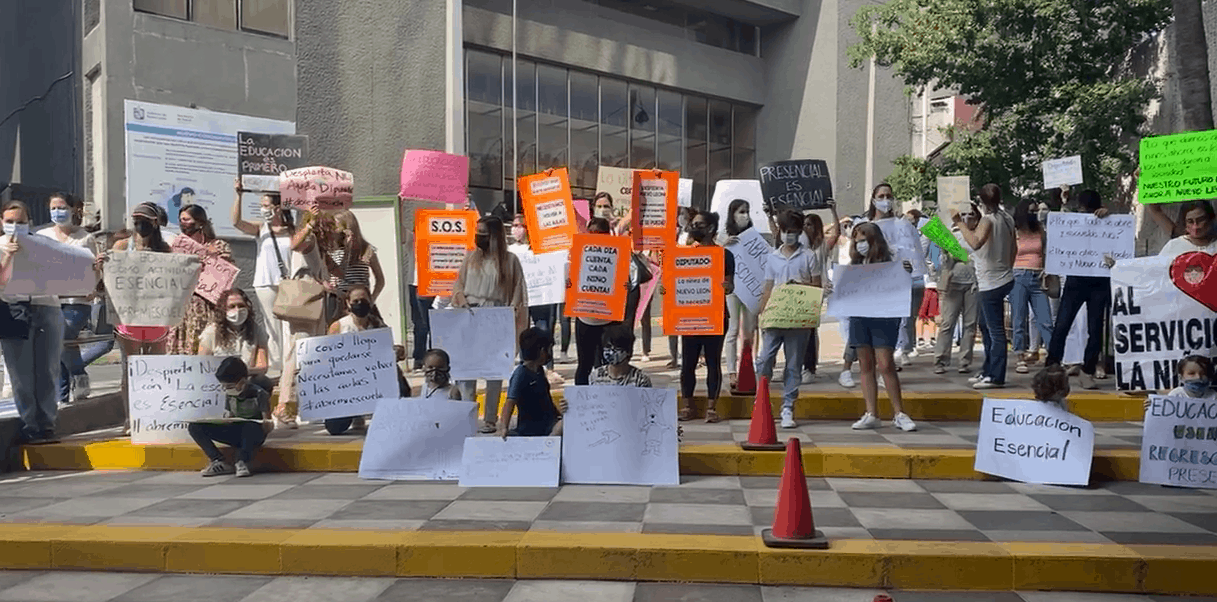 Monterrey N.L.- Padres de familia del colectivo “Abre mi Escuela”, la Unión Neolonesa de Padres de Familia y directores de escuelas públicas y privadas protestaron afuera del Congreso Local con el objetivo de pedir el apoyo de los diputados para que regresen las clases presenciales.