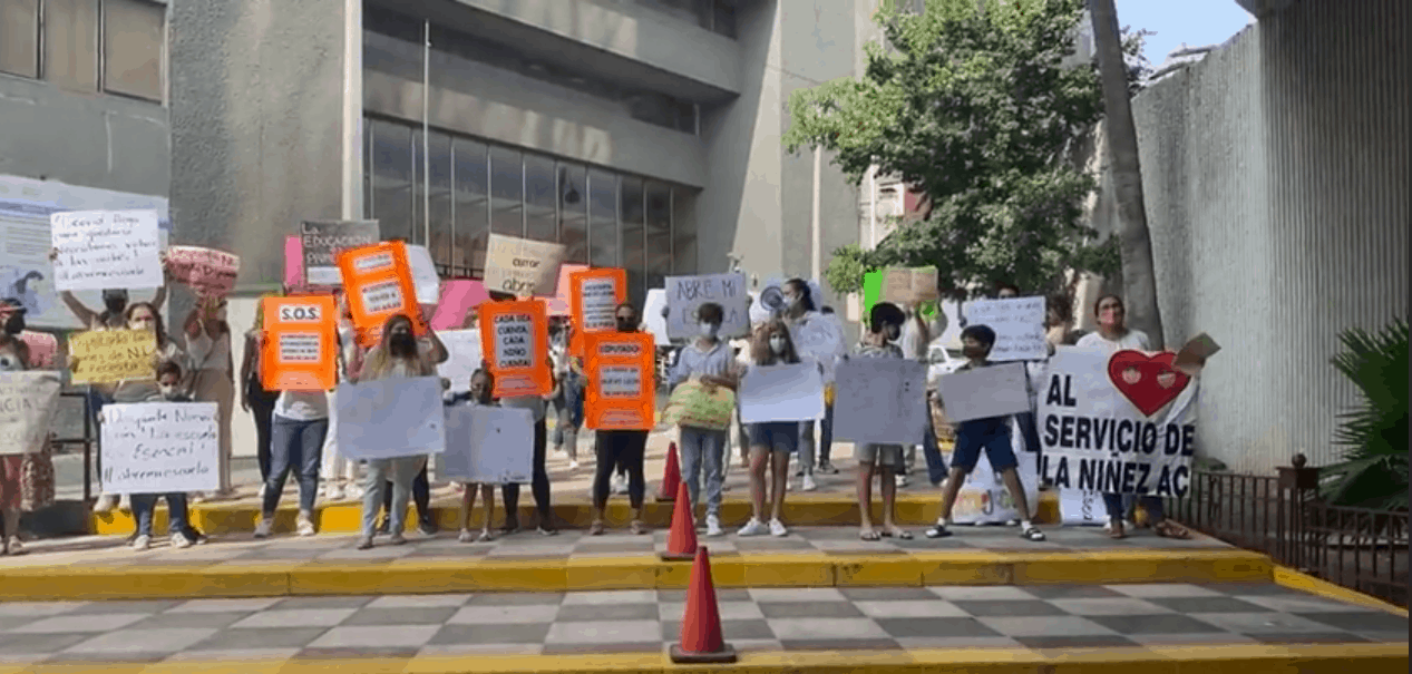 Con pancartas y mantas, los manifestantes expresaban su inconformidad, por las decisiones de mantener cerradas aun las escuelas y colegios.