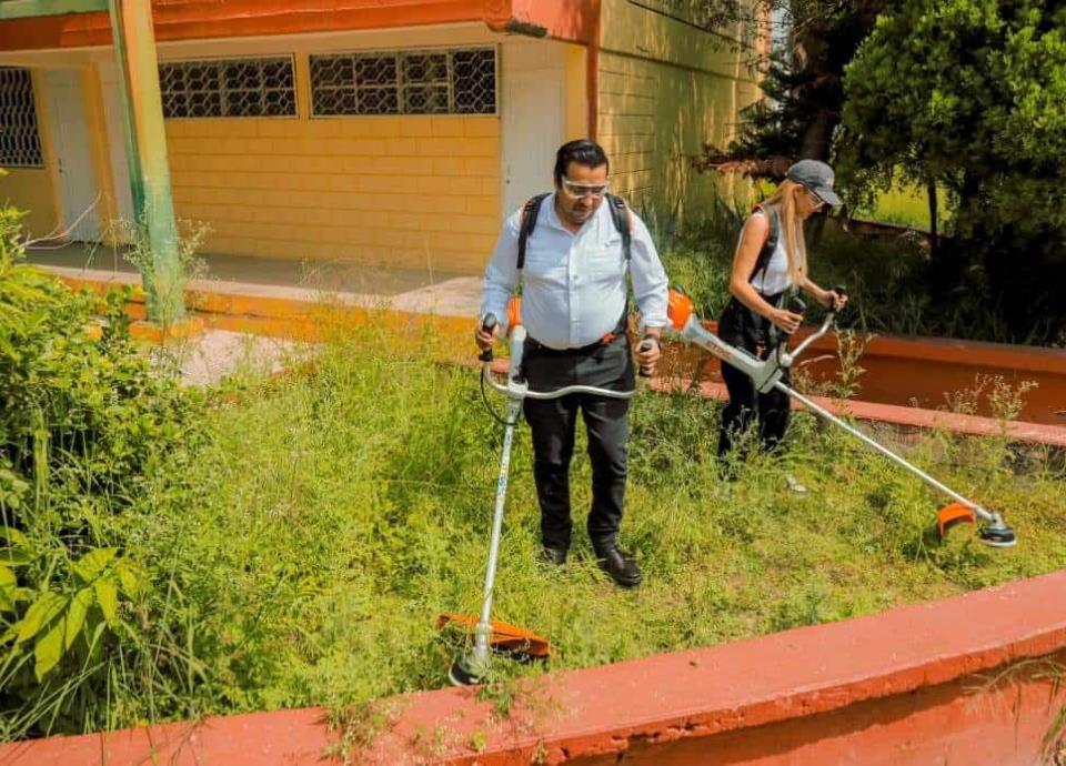 Aunado a los trabajos de deshierbe en las escuelas, la administración municipal ha implementado una brigada de fumigación en las instalaciones de las escuelas con unidades y moto mochila.