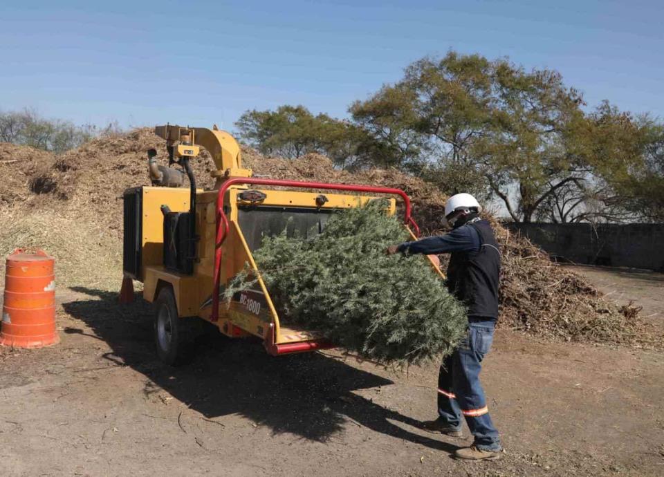 Carrillo Martínez recorrió el área de triturado donde maquinaria industrial procesa los pinos que se recolectan de los centros de acopio que están distribuidos por toda la ciudad.