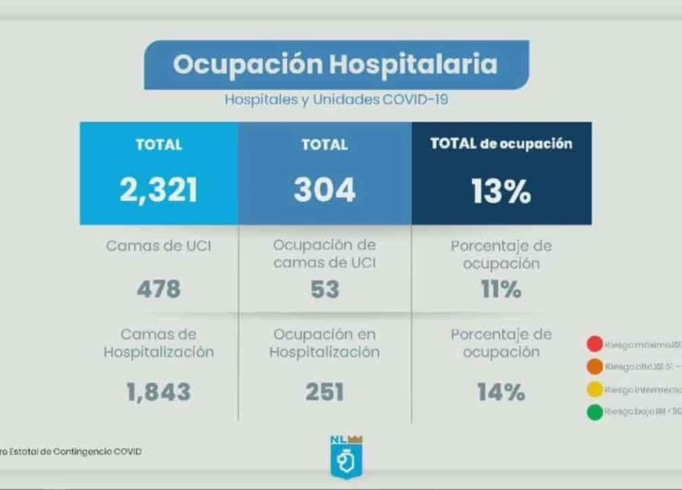 La Capacidad Hospitalaria en Nuevo León se reportó en un 13 por ciento, con 304 personas que requieren de atención especializada por el Covid-19, con ello terapia intensiva está al 11 por ciento y ocupación en camas es del 14 por ciento.