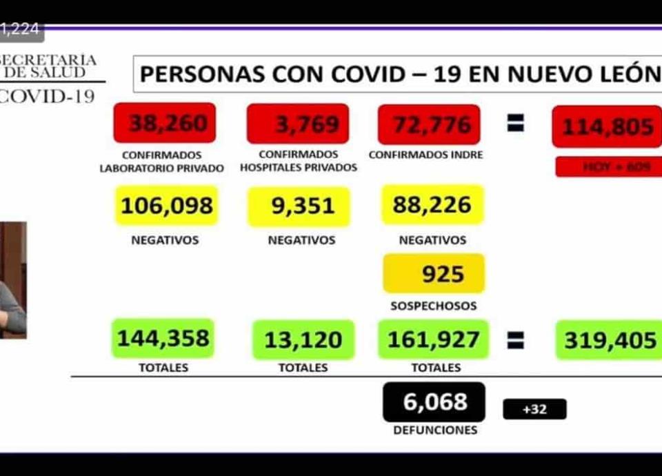 Con la cifra más baja en los últimos días, Nuevo León registró un total de 609 casos positivos de Covid-19, con lo que se llegó a las 114 mil 814 personas infectadas, en los más de 9 meses de la emergencia sanitaria.