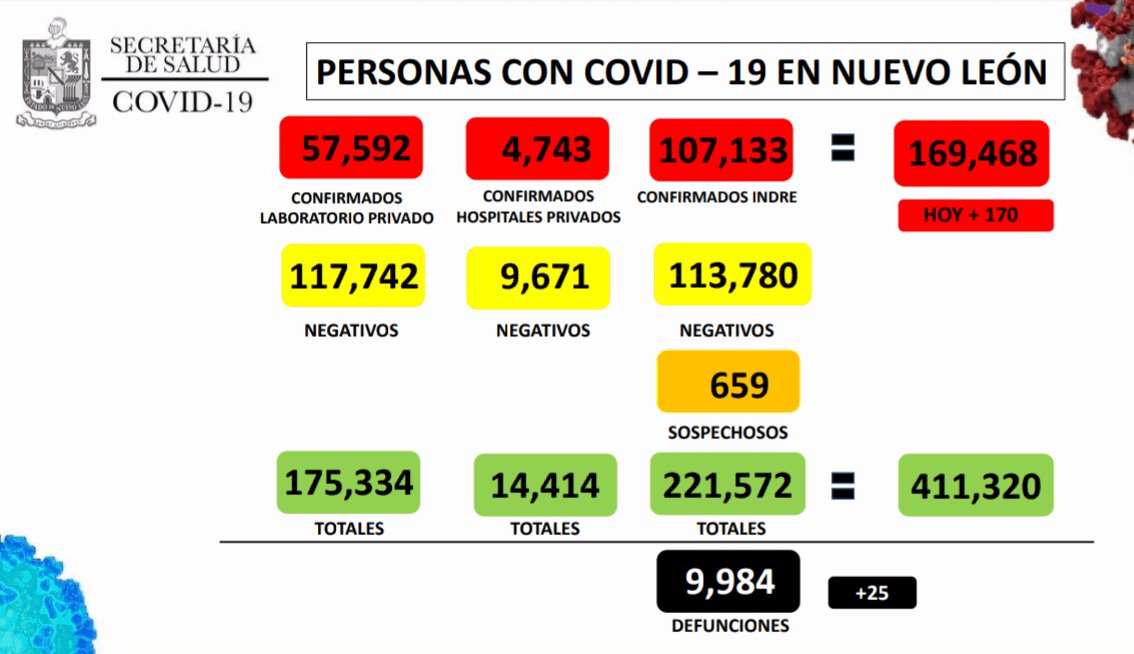 Reporta NL 170 nuevos contagios por Covid-19