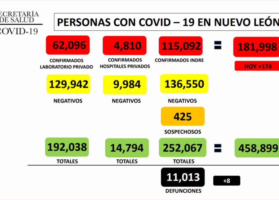 Monterrey N.L.- La Secretaría de Salud reportó este jueves la cifra más alta de contagios por Covid-19 en la entidad con 174 casos nuevos, y así estar alcanzando la cantidad de 181 mil 998 infecciones de este virus.