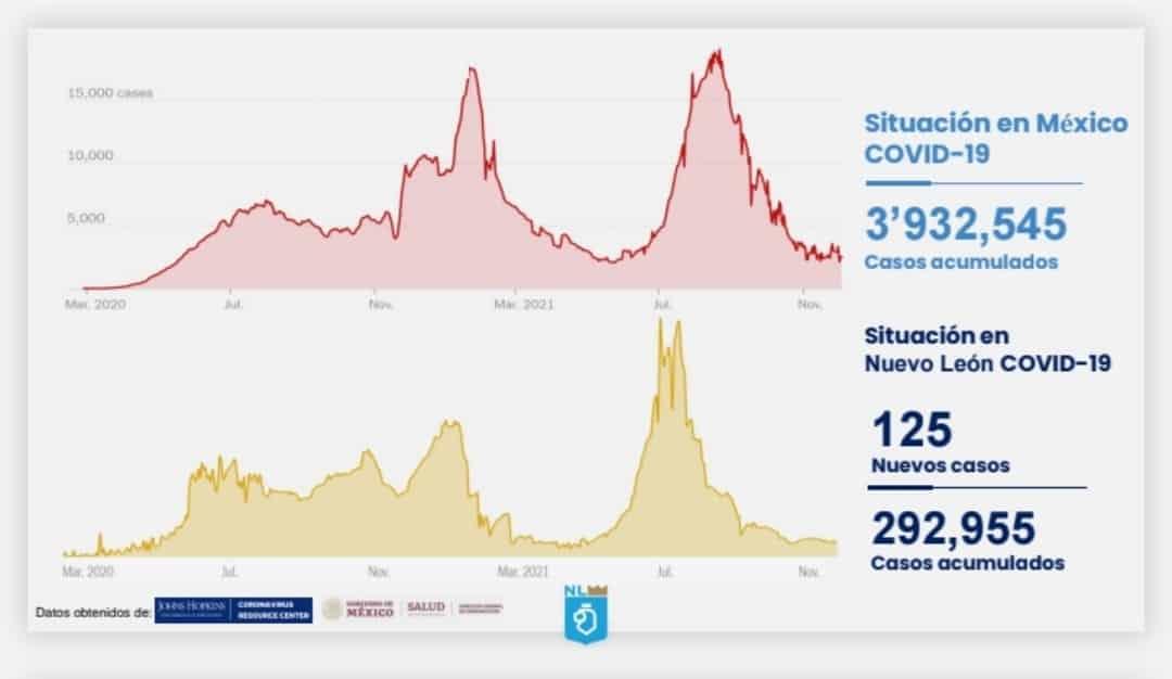 La Secretaría de Salud en Nuevo León reportó este domingo 125 casos de Covid-19 y cinco defunciones, en el último informe.