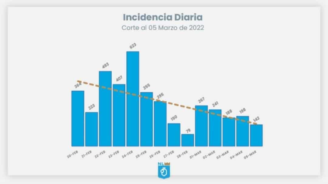 La Secretaría de Salud en Nuevo León informó que se registraron 142 casos de Covid-19, 56 menos que un día previo, 284 hospitalizaciones y nueve defunciones, en las últimas 24 horas.