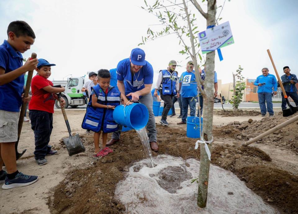 El alcalde de Pesquería, Patricio Lozano, acompañado de vecinos y servidores públicos municipales, dedicó la mañana de este sábado a la reforestación de espacios públicos que, a corto y mediano plazo redituará en mejor calidad del aire para los residentes de la ciudad.