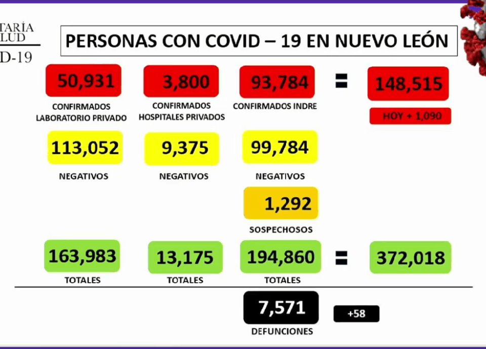 Suma 148 mil 515 casos de Covid-19 en NL