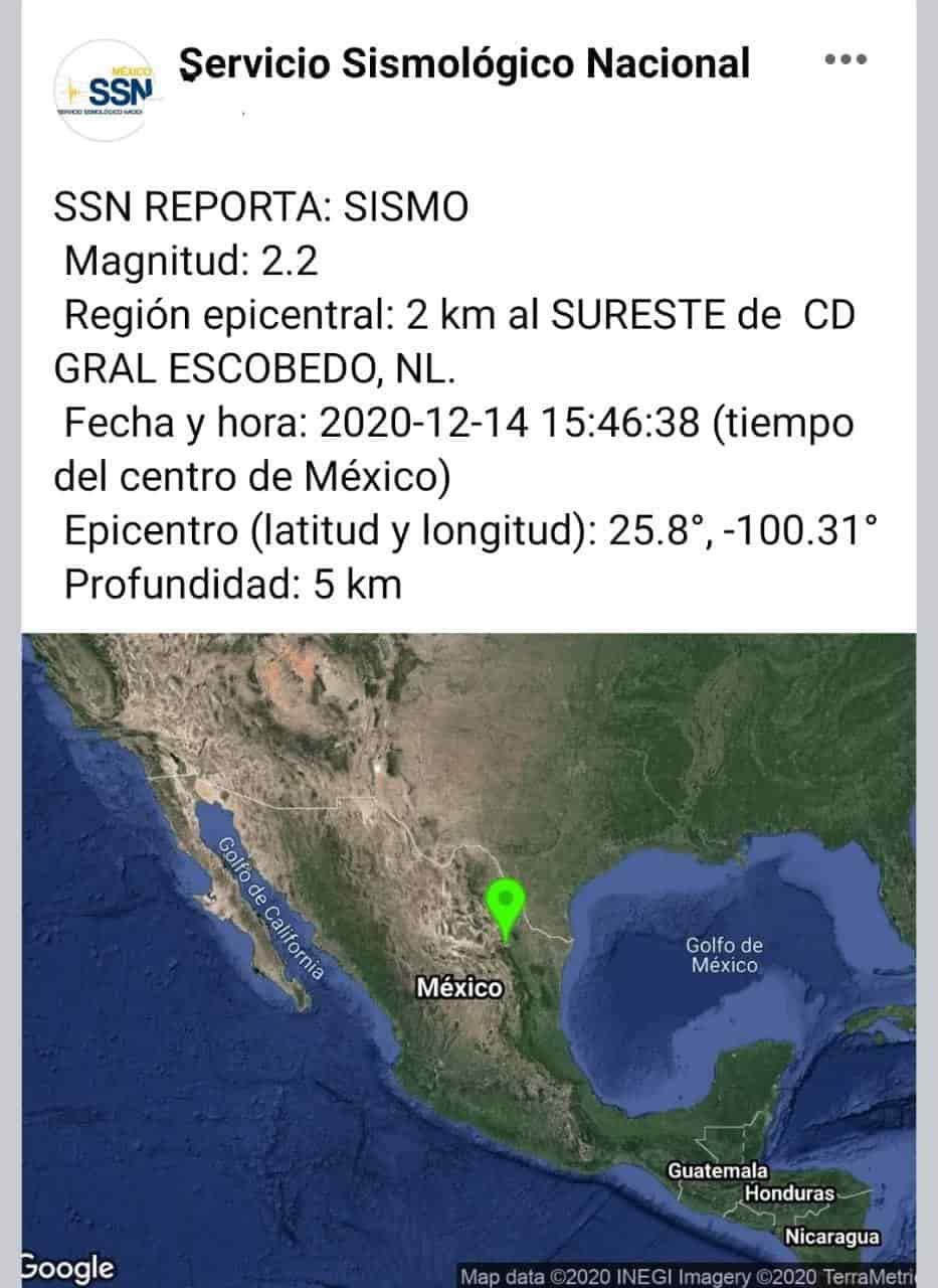 El Sistema Sismológico Nacional dio cuenta de un movimiento telúrico a 2 kilómetros al sureste de General Escobedo y 5 kilómetros de profundidad.