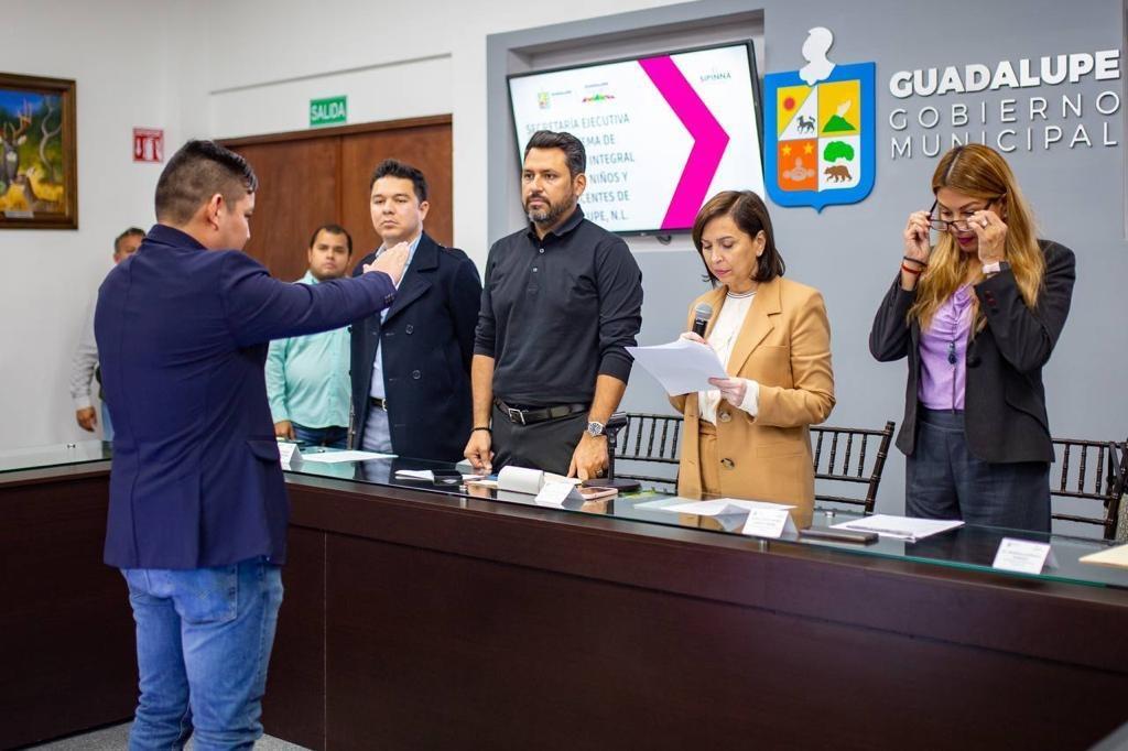 Cristina Díaz Salazar, alcaldesa de Guadalupe tomó protesta al nuevo Secretario Ejecutivo del Sistema de Protección de Niñas, Niños y Adolescentes (SIPINNA) en Guadalupe, Alan Carrizales, con el objetivo de trabajar en conjunto, a fin de garantizar los derechos de las niñas, niños y adolescentes.