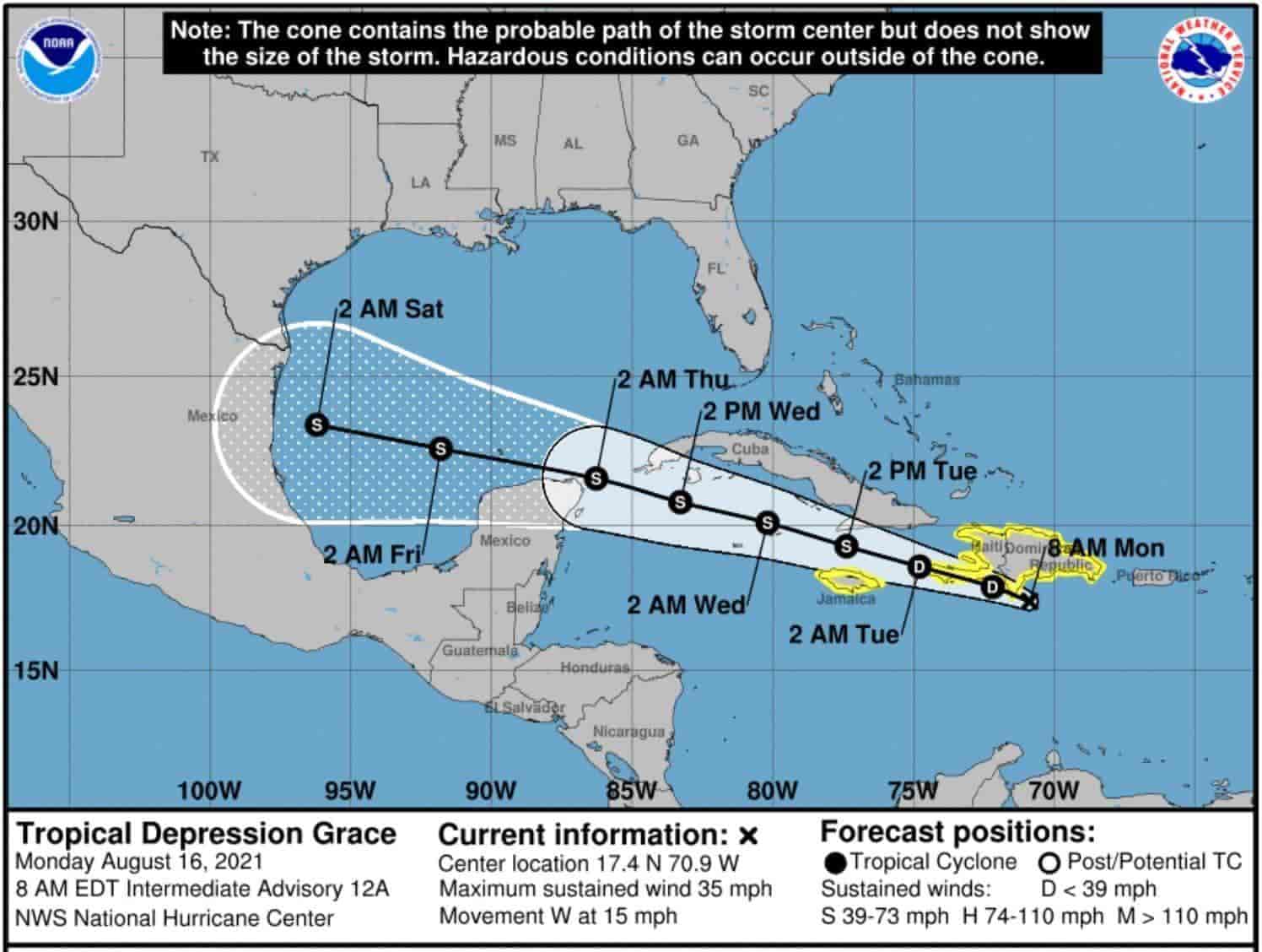 Al momento el fenómeno meteorológico se ubica al sur de República Dominicana, donde mantiene vientos de 56 kilómetros por hora y un movimiento hacia el Oeste con una velocidad de 24 kilómetros por hora, tocando costas mexicanas el próximo jueves.