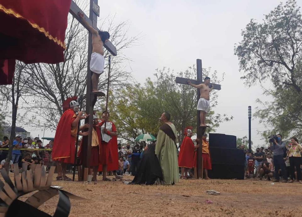 Tras recorrer siete estaciones, al filo del mediodía la procesión llegó a la antigua estación del Ferrocarril, en la colonia Industrial, donde Jesús fue crucificado junto a los delincuentes Dimas y Gestas.