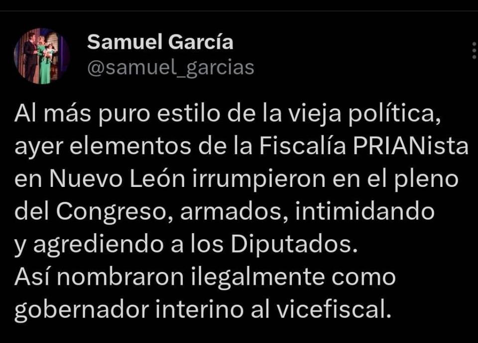 "Al más puro estilo de la vieja política, ayer elementos de la Fiscalía PRIANista en Nuevo León irrumpieron en el pleno del Congreso, armados, intimidando y agrediendo a los Diputados. Así nombraron ilegalmente como gobernador interino al vicefiscal", público en su cuenta de X.