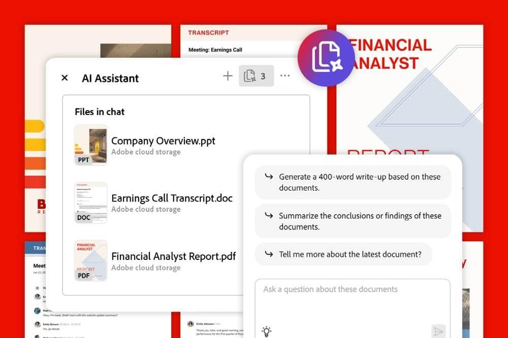 A partir del 18 de junio, los clientes de Acrobat ya pueden crear y editar imágenes en los casi 3 billones de PDFs en circulación utilizando indicaciones de texto gracias a Adobe Firefly con IA generativa. Acrobat es la primera solución PDF en ofrecer capacidades de generación de imágenes dentro de la aplicación. Las nuevas funciones en el Asistente de IA de Acrobat, un motor conversacional profundamente integrado en los flujos de trabajo de Reader y Acrobat, permitirán a los clientes hacer preguntas, obtener información y crear contenido a partir de grupos de PDFs y otros tipos de documentos, incluidos Microsoft Word, Microsoft PowerPoint, archivos de texto y más. Adobe también ha anunciado capacidades mejoradas de transcripción de reuniones en el Asistente de IA.