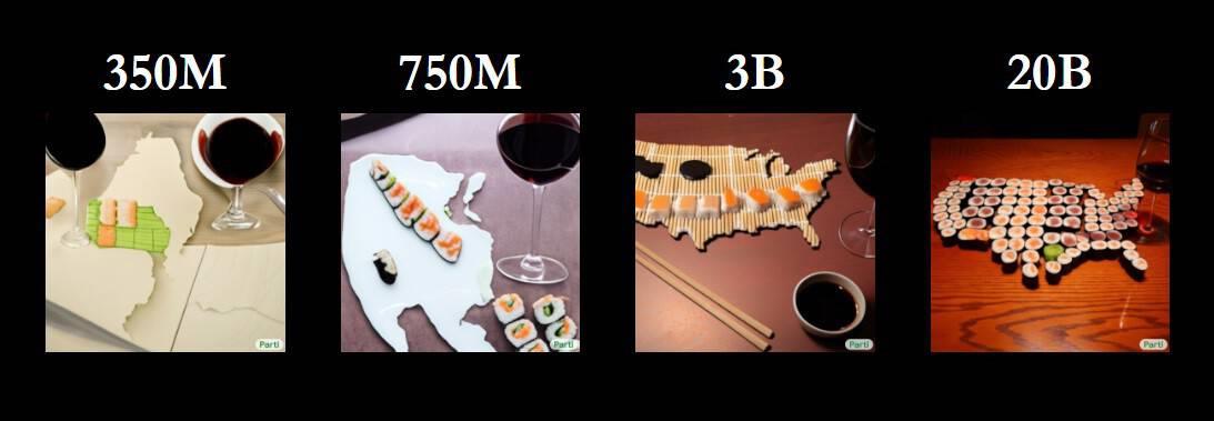 En uno de los intentos, utilizaron el siguiente texto de entrada: "A map of the United States made out of sushi. It is on a table next to a glass of red wine (Un mapa de Estados Unidos hecho con sushi. Está en una mesa al lado de una copa de vino tinto)". Como podemos ver, la escala 350M presenta una confusa representación, las cosas mejoran en la 750M, presentan "creatividad" en la 3B y un asombroso resultado en la 20B.