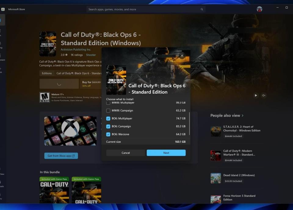 El mejor ejemplo de esta nueva función lo tenemos en Call of Duty Black Ops 6, un juego que puede llegar a superar los 160 GB de espacio en disco, pero que podremos dividir e instalar por partes en la Microsoft Store. Como vemos en la imagen adjunta si solo queremos jugar la campaña el espacio ocupado se reducirá a 83,2 GB.