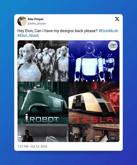 A través de su cuenta en Twitter, el director Alex Proyas acusó a Musk de utilizar diseños de su película Yo, Robot en los prototipos de Tesla. Según Proyas, algunos de los robots, vehículos y taxis presentados por la compañía tienen un notable parecido con los de la cinta. Además, Musk nombró la exposición en la que se mostraron estos diseños como "We, Robot", en referencia directa a la obra de Isaac Asimov, lo que ha intensificado las sospechas de plagio.