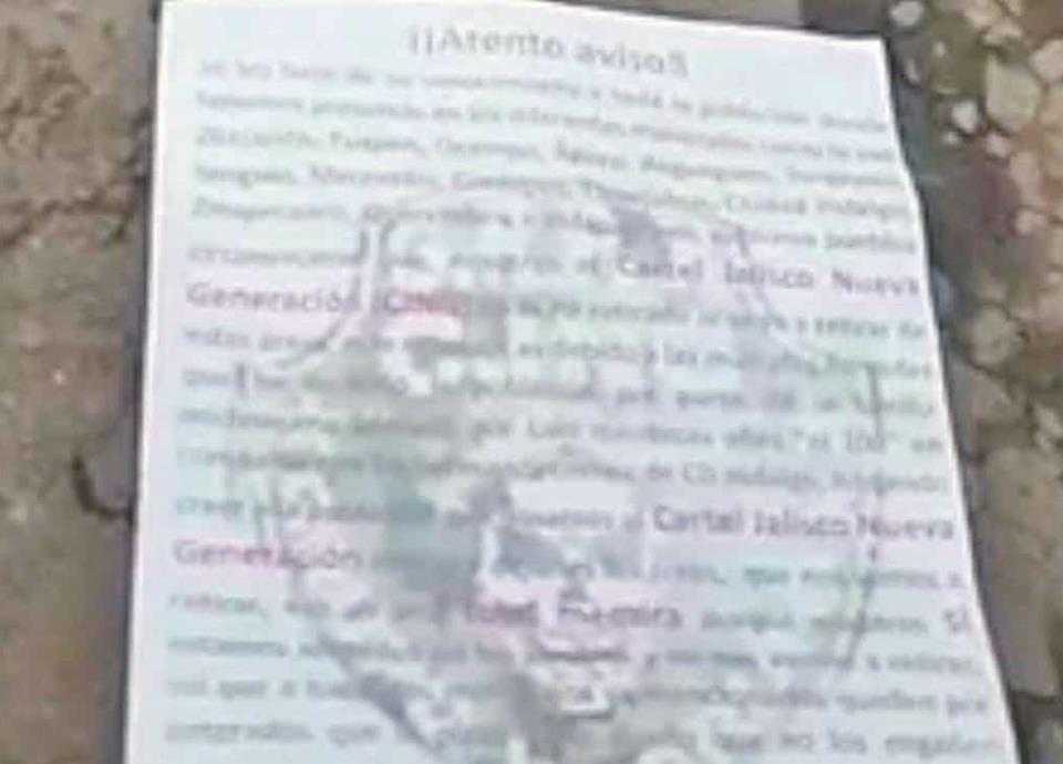 de Michoacán, la ciudad de Zitácuaro —en el oriente de la entidad— amaneció este jueves con miles de volantes con amenazas a la población, presuntamente por parte del mismo grupo criminal. Los panfletos generaron temor entre la población de que se produzcan nuevos enfrentamientos entre esta célula criminal y el grupo delictivo de La Familia Michoacana, liderado por Medardo Hernández Vera, El Mantecas, a quien se menciona en el mensaje del CJNG y es de los hombres más buscados del país. Las autoridades municipales se encargaron de retirar los volantes de la vía pública. Por la tarde, medios locales informaron del incendio de un camión de carga en la ciudad. De acuerdo con las versiones, varios hombres que viajaban en motocicletas le rociaron gasolina y le prendieron fuego y, posteriormente, se dieron a la fuga. La violencia por parte del crimen organizado se incrementó desde el pasado domingo, cuando se reportó la desaparición de Ángel Gutiérrez Aguilar, El Kiro, uno de los fundadores de las autodefensas de Tepalcatepec. Esto dio origen a varios días de bloqueos carreteros y enfrentamientos en los alrededores de los municipios de Tepalcatepec y Buenavista. "El Kiro" fue liberado el martes pasado. El miércoles, células criminales ingresaron a Tarecuato, donde atacaron comercios y la jefatura de tenencia, donde murió una persona. Por la noche se informó de una emboscada a policías en Peribán, en la que falleció un elemento.