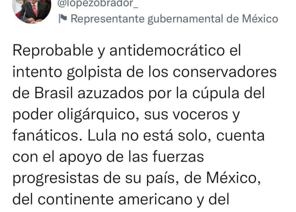 CIUDAD DE MÉXICO, enero 8 (EL UNIVERSAL).- El presidente Andrés Manuel López Obrador calificó como reprobable y antidemocrático el "intento golpista" de simpatizantes del expresidente de Brasil, Jair Bolsonaro quienes buscan ingresar al Congreso de ese país para exigir la intervención militar y con ello derrocar al nuevo presidente Luiz Inacio Lula da Silva.