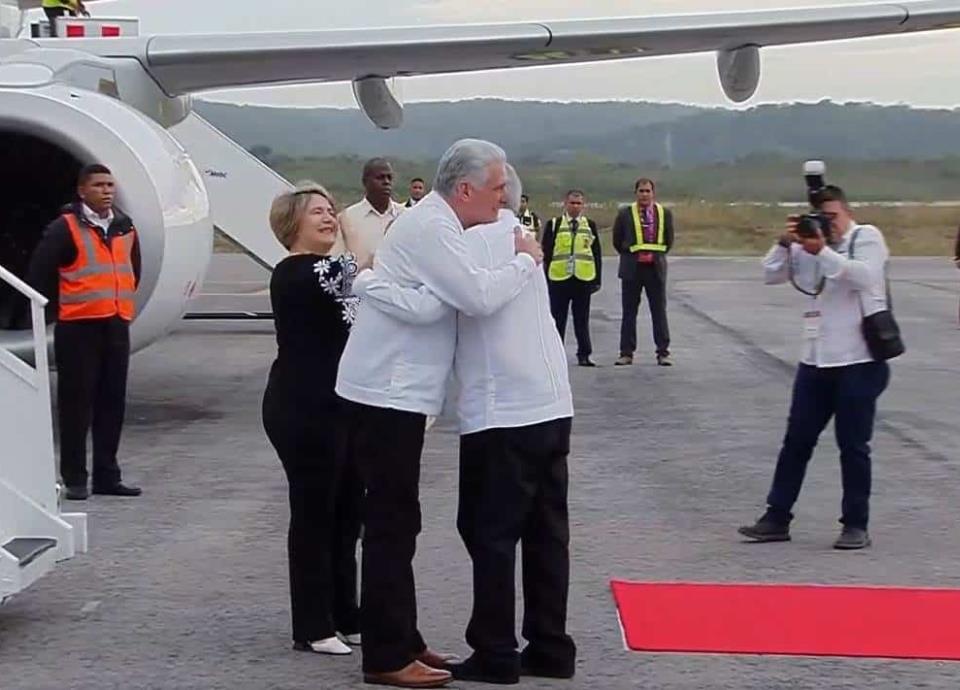 A las 8: 30 horas, el presidente Andrés Manuel López Obrador recibió al pie de la escalinata del avión a su homólogo de la isla, quien llegó acompañado por su esposa Lis Cuesta Peraza.