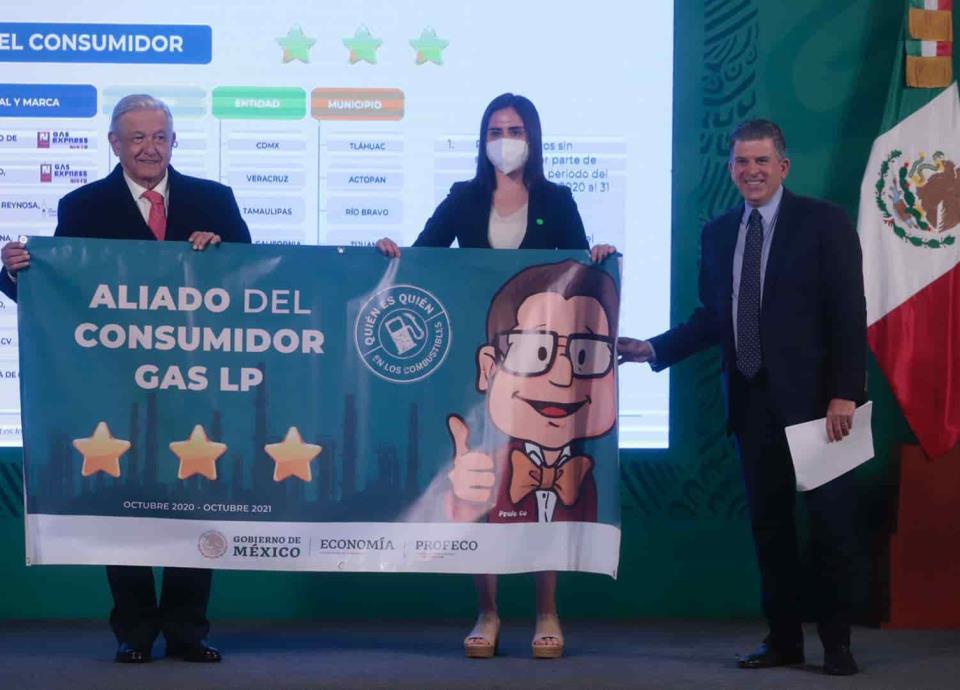 Ricardo Sheffield Padilla, titular de la Procuraduría Federal del Consumidor (Profeco), entregó el reconocimiento a Bertha Judith Ceja, representante de Gas expreso de México; Cinthia Rijano, de Gas Exprés Nieto; y Quinogas, representada por Javier Dorantes, los tres por dar litros de a litros.