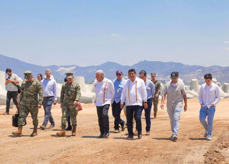 Acompañado por el almirante José Rafael Ojeda Durán, encargado de la Secretaría de Marina (Semar), y por el gobernador de Oaxaca, Salomón Jara (Morena), el titular del Ejecutivo también revisó los avances en la construcción del rompeolas del nuevo puerto de Salina Cruz.
