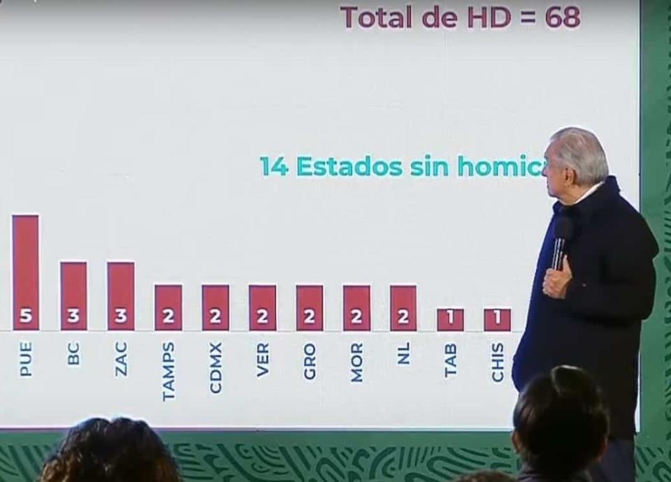 "Les puedo decir que ayer no fue un día malo porque hubieron 63 o 67 homicidios (..) 68", expuso el Presidente en una lámina que mostró que 14 estados no registraron este delito.