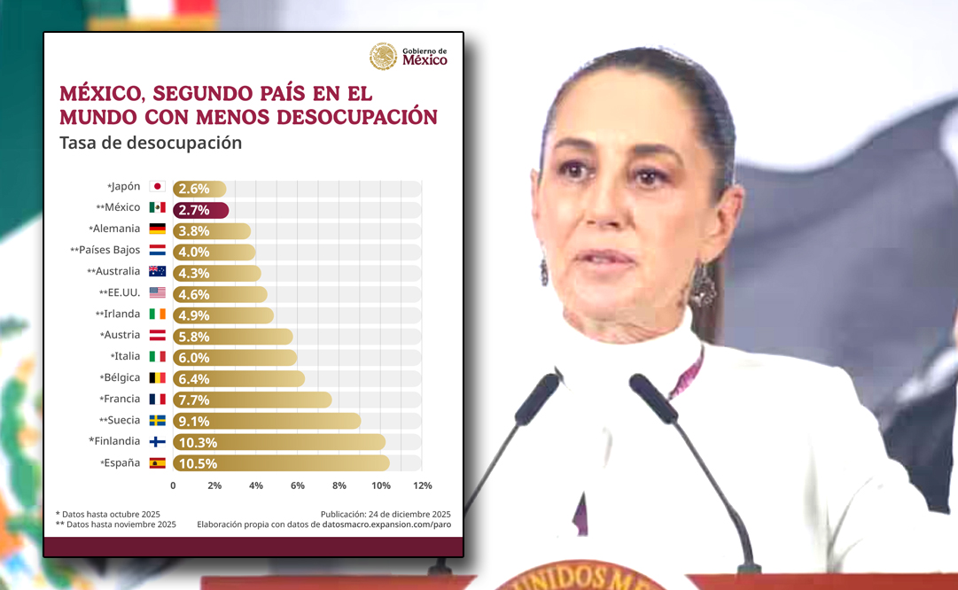 La Mandataria federal Claudia Sheinbaum Pardo indicó que México cerró el 2025 como el segundo país con menos desocupación, después de Japón.